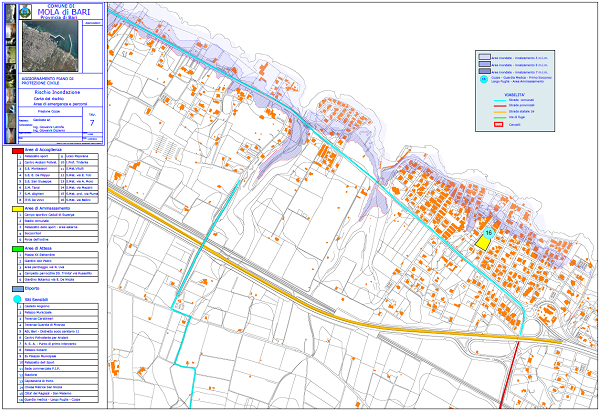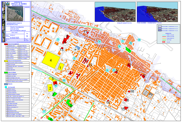 Dall’analisi degli eventi storici sopra riportati si è ritenuto opportuno provvedere ad una simulazione cartografica che possa rendere un quadro di previsione delle aree comunali che possono essere coinvolte da un tale fenomeno. Negli elaborati grafici seguenti sono state riportate le simulazioni per onde che possano portare ad un innalzamento massimo delle acque di 3,5 e 7 metri.
